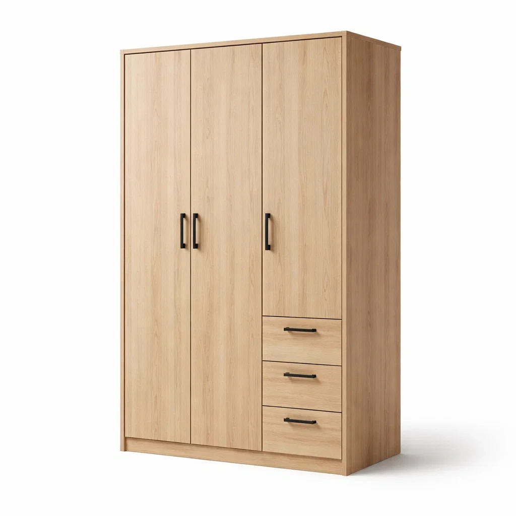 Realizzato in pannelli di truciolato di rovere con maniglie in metallo.