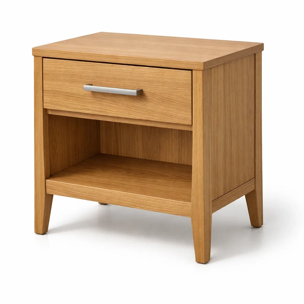 Il comodino è realizzato in legno di rovere con una finitura naturale. Misura 45 cm in lunghezza, 35 cm in larghezza e 55 cm in altezza.