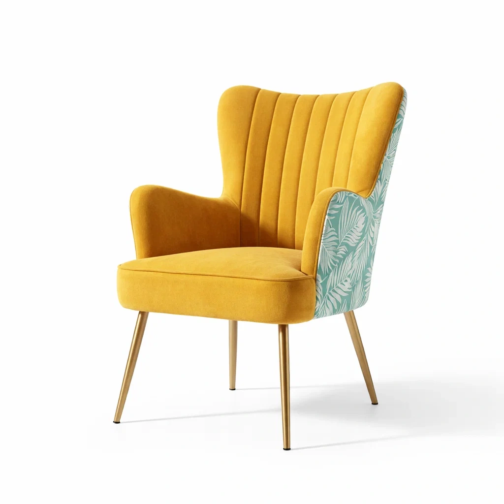 Questa poltrona ha un rivestimento in velluto con un motivo a foglie verdi sul retro. Le gambe sono in metallo. Il colore predominante è il giallo. La seduta è imbottita con schiuma per comfort. Dimensioni complessive: altezza 80 cm, larghezza 70 cm, profondità 78 cm. Peso netto: 7.5 kg. Capacità di carico: 120 kg.